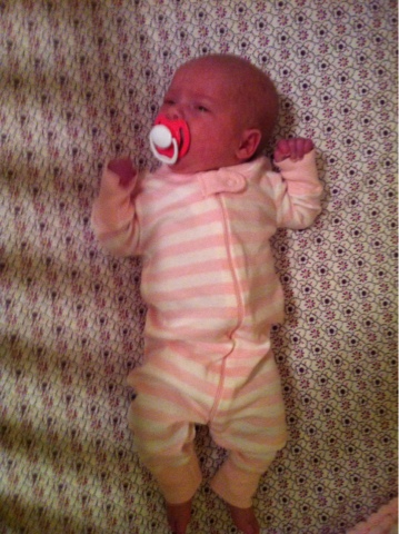 Aka ZZ, Dragon, ZaZu and Stinkbug. Zadie has had personality plus from day 1. She frequently has a skeptical look on her face as she surveys the scene. She likes to protest most everything--except for eating. She hates being swaddled, growls if you wake her up, growls when you lay her down for the night, growls when she's being burped, and the list goes on. Recently she has started fussing less often (or maybe Lia is just fussing more often), and has flashed us a couple smiles when the stars all align just right. She still does not sleep well at night and thinks its okay to be awake and fussing from 10-2. Today she rolled over from her front to her back. She is built very differently than her sister. Lia feels firm and much more sturdy. Zadie feels like a little pile of noodles. All in all ZZ brings us lots of laughs at her crazy faces. We love her like crazy.